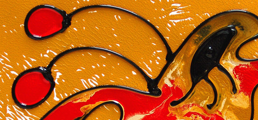 It takes about 14 days before a painting is ready. First Erik paints thick black lines on the canvas with a pyramid shaped paint brush. He then colors the formed sections with 12 coats of paint, using three up to eleven colors. He added an ingredient to the paint that makes it thicker and more substantial. Every layer has to dry and harden. To Erik’s opinion every single piece of his paintings has to consist of 12 layers. After that he polishes the painting by hand and adds three layers of varnish. This gives the painting a glassy look.